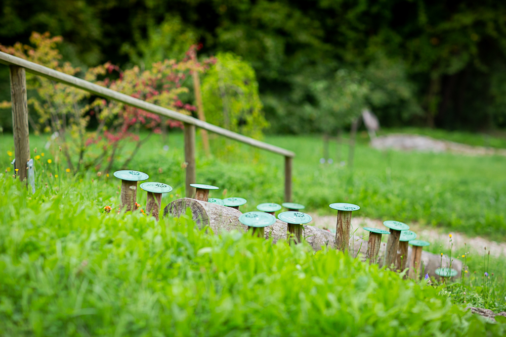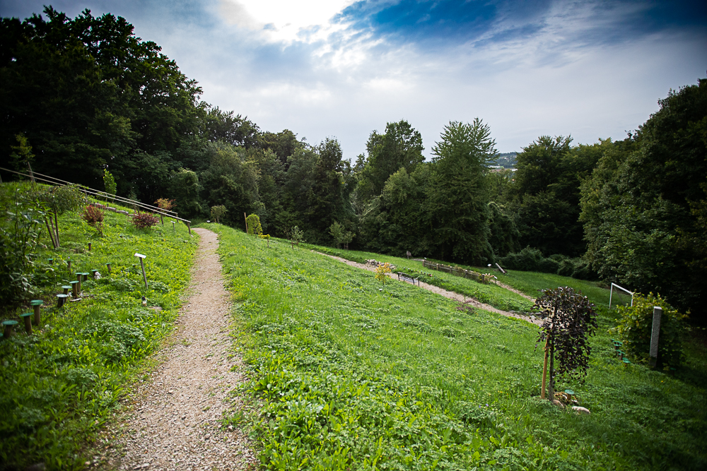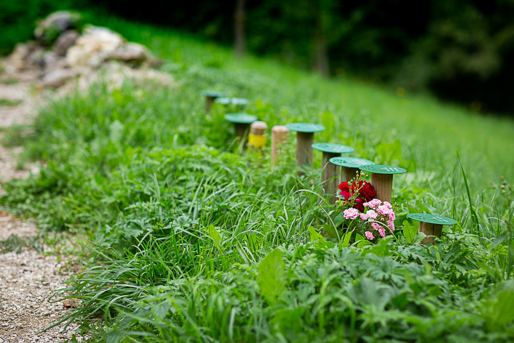 Vierzehn Stationen geben Impulse zum Sinnieren und sind zugleich Grabplätze. Sinn kommt von den Sinnen, die hier angeregt werden schon allein durch die unterschiedlichen Bodenbeläge: vom Mulch, über Hackschnitzel, zu Gras, Sand, Kies und Schotter.